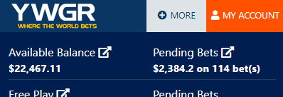 Log in to your Youwager.lv account and click on the orange ‘MY ACCOUNT’ button at the top right and the press ‘Pending Bets’ at the top right of the menu.